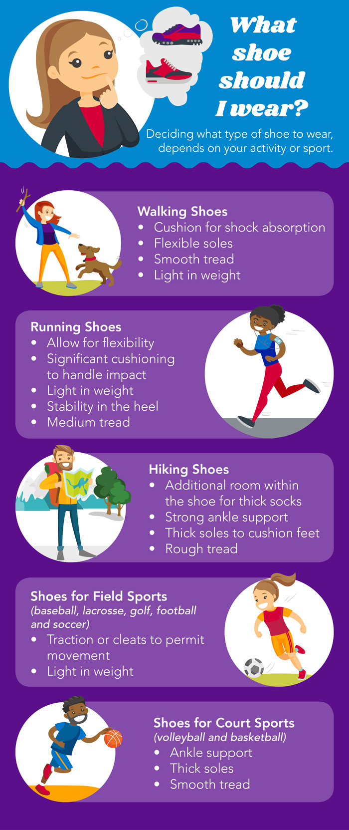 - Choose the right shoe: Use sport specific shoes that fit your foot type. Cross training shoes are a good shoe if you participate in a variety of activities, but it’s best to use shoes designed specifically for the sport you are playing.