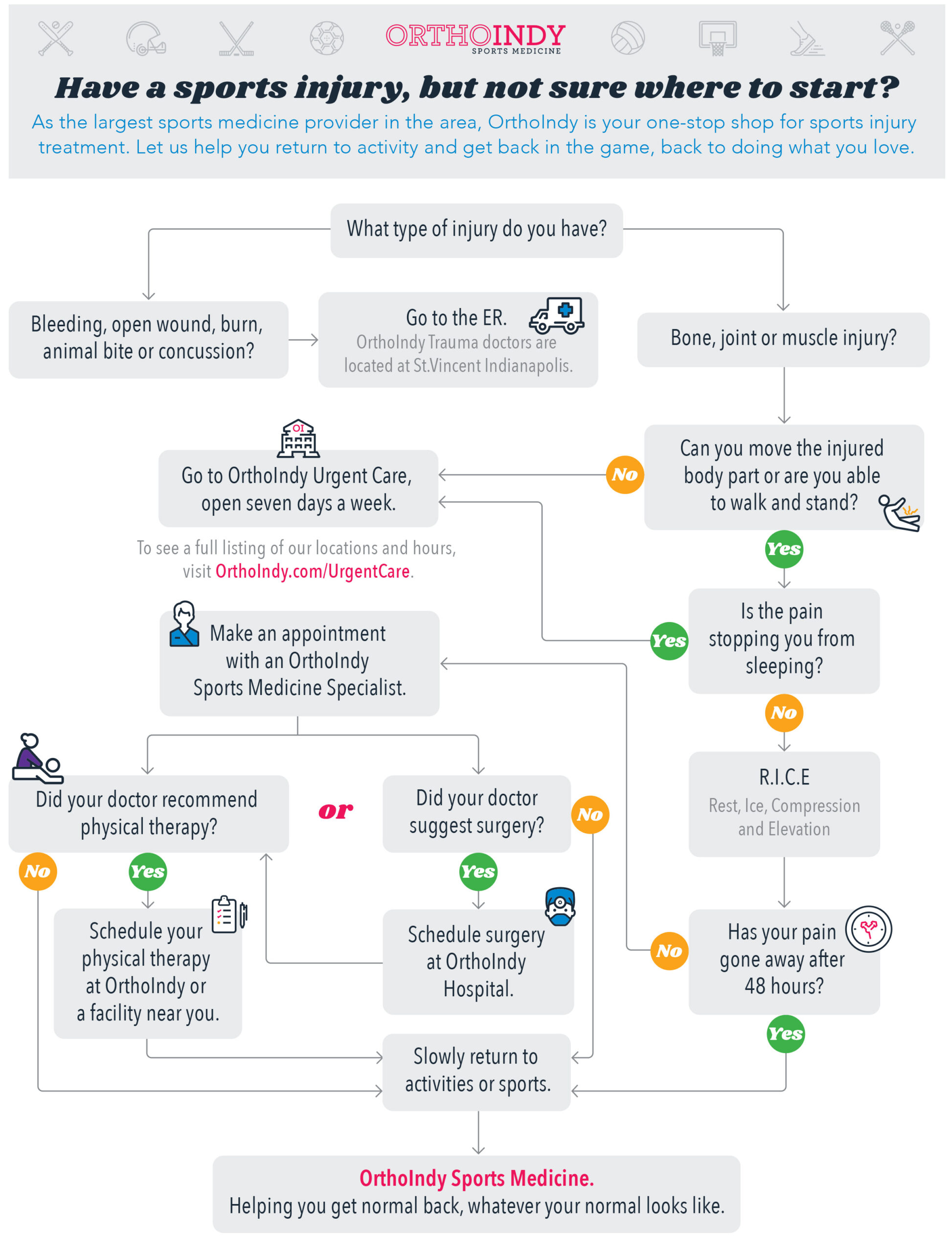 If you haven’t been able to find relief with at home treatment options for your sports injury, you might need professional help. OrthoIndy sports medicine specialists are experts at what they do.