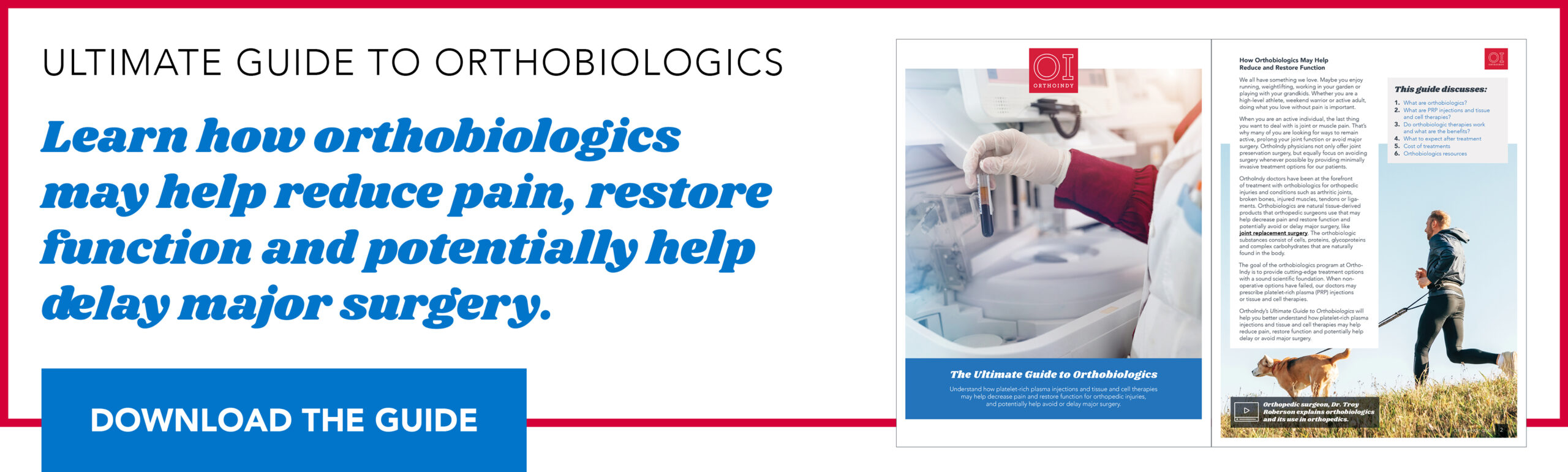 Dr. Roberson may use orthobiologic therapies when other non-surgical treatment options, such as physical therapy, medication or cortisone injections have failed. A platelet-rich plasma (PRP) injection may be an option to help relieve your pain and restore function to the affected joint.